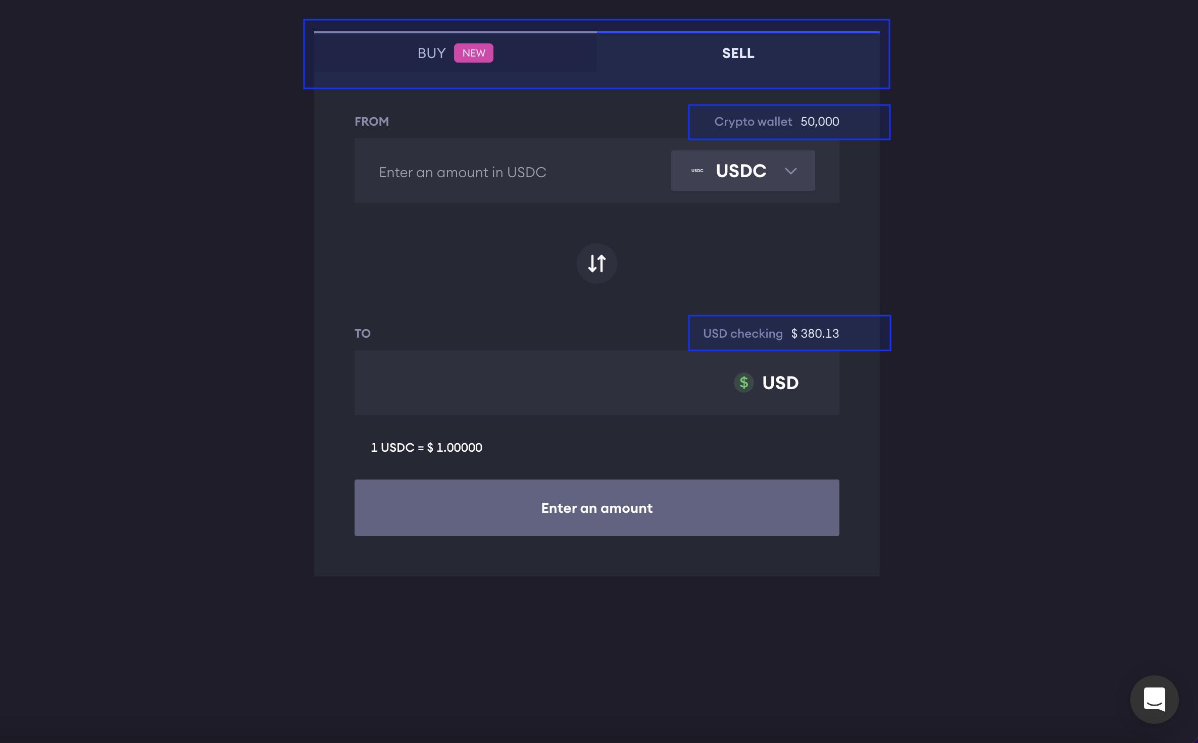You can see the balance associated with the crypto wallet and USD account at the top right corner of the fields.