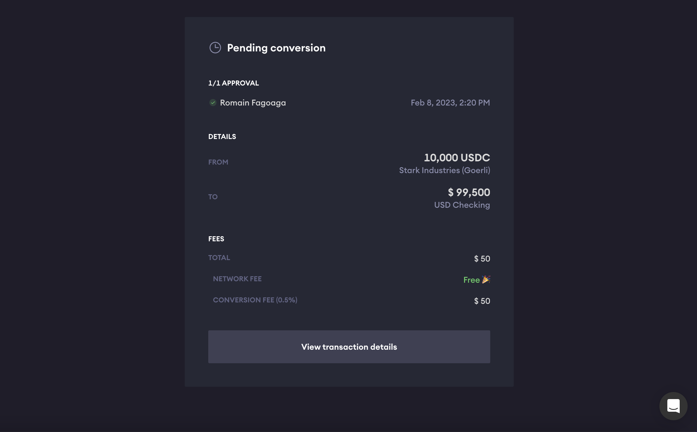 <figure><img src="https://3235896353-files.gitbook.io/~/files/v0/b/gitbook-x-prod.appspot.com/o/spaces%2FWt8di7pt4heDCdwbVGnj%2Fuploads%2F8MVItckZ6nDkUP6zDbWV%2FCapture%20d%E2%80%99e%CC%81cran%202023-02-08%20a%CC%80%2014.18.40.png?alt=media&#x26;token=c4077a58-623c-47c5-8216-159a205e0c94" alt=""><figcaption><p>Convert to USD - Preview screen</p></figcaption></figure>