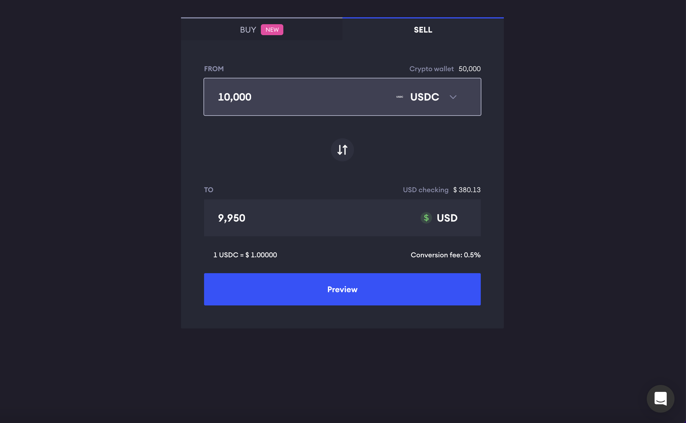 **Step 3 -** Let's choose "*Sell*" in this example, we're going to convert 10,000 USDC to USD. Enter the amount of USDC you wish to convert and click "*Preview*" to display the fees.